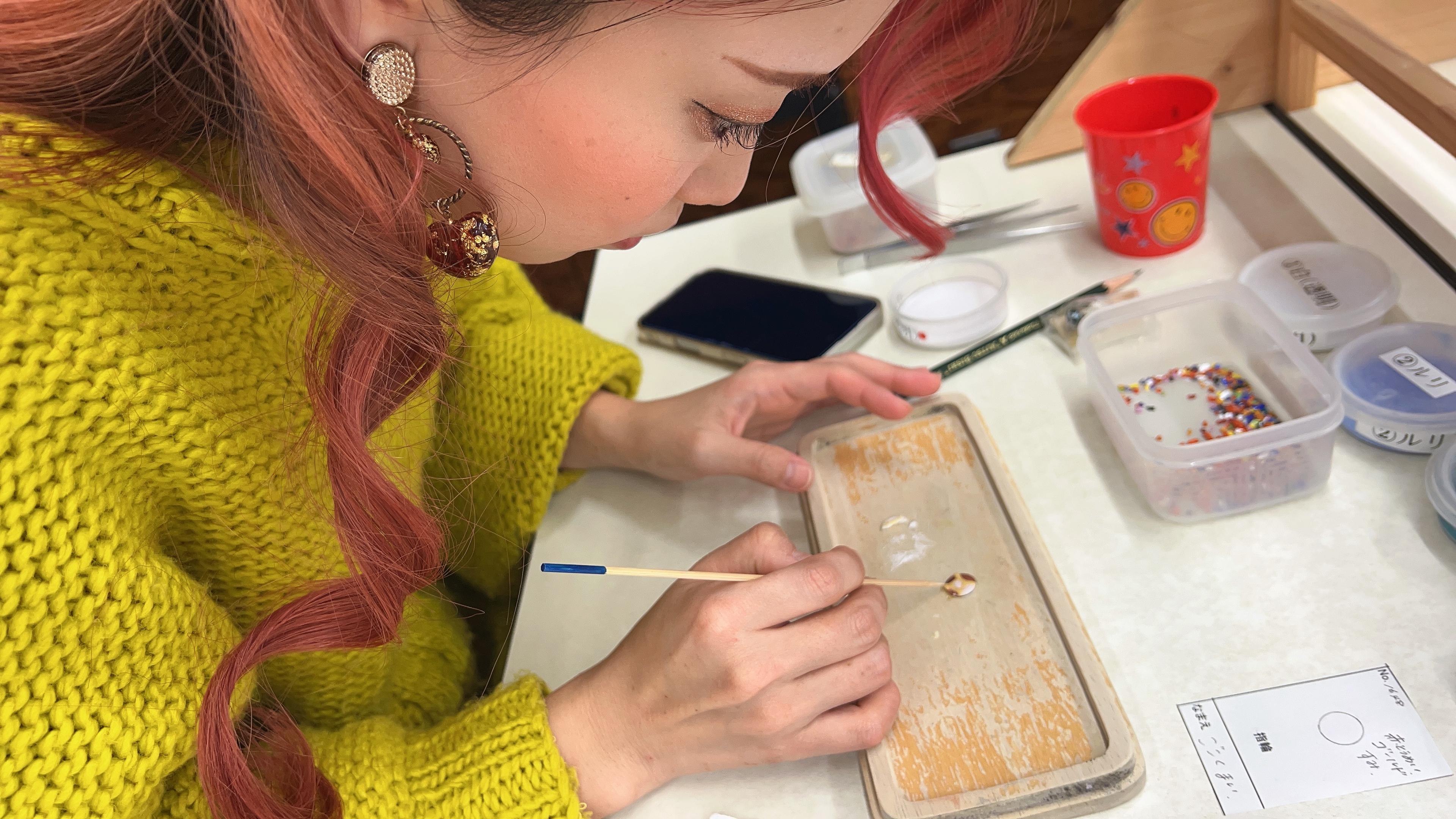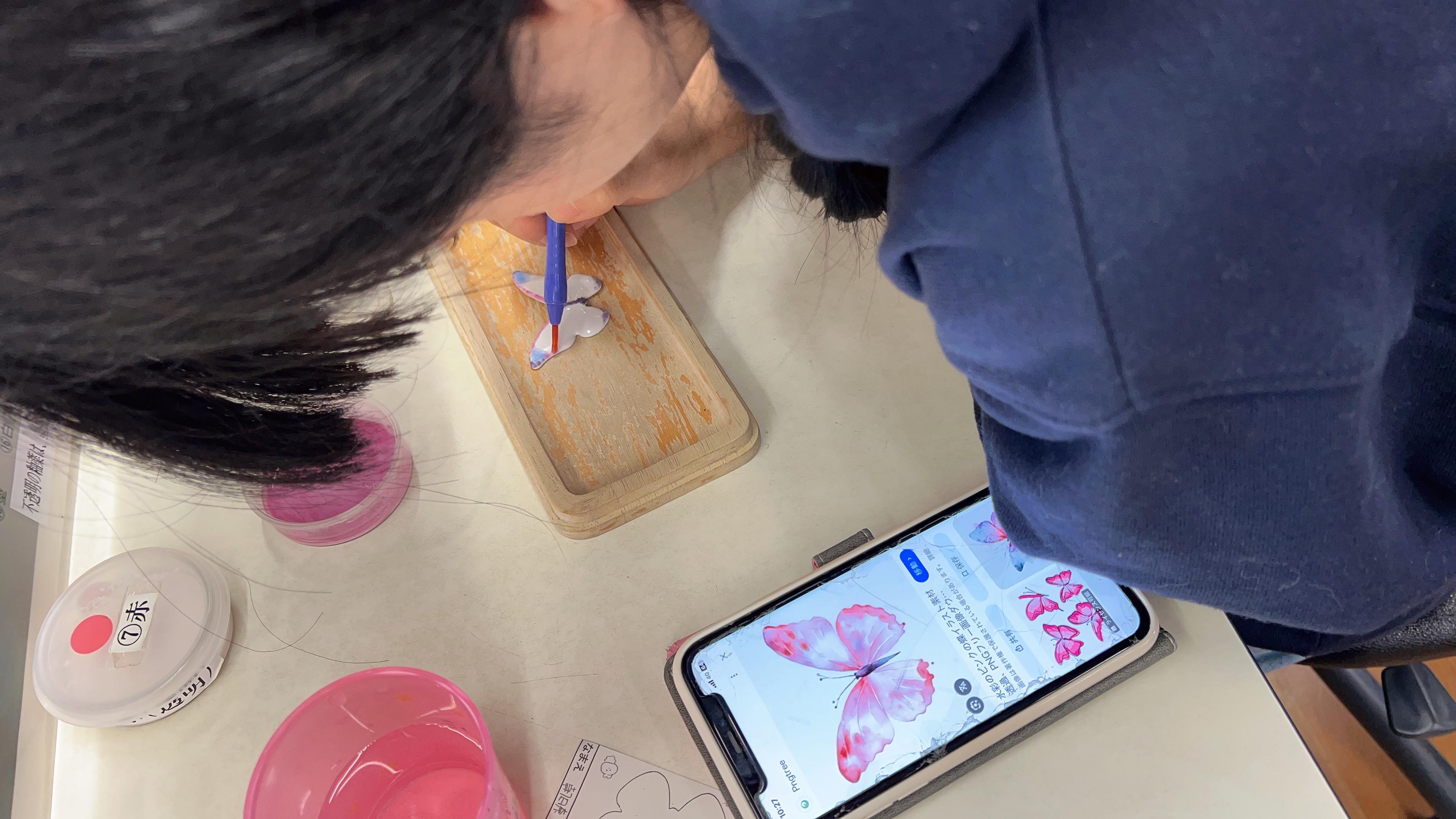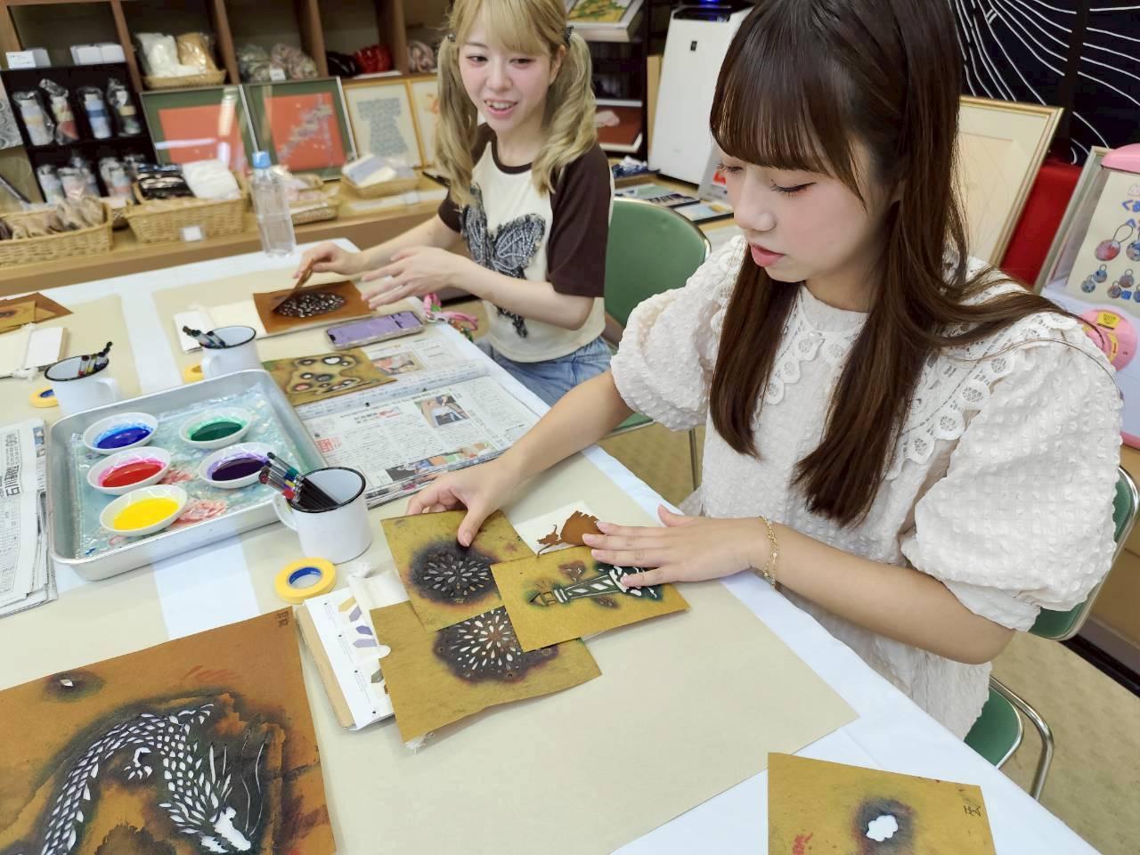この日は愛知県の伝統的工芸品「名古屋黒紋付染」のマーブリング染め体験と、東京の伝統的工芸品「江戸切子」を体験しました。
