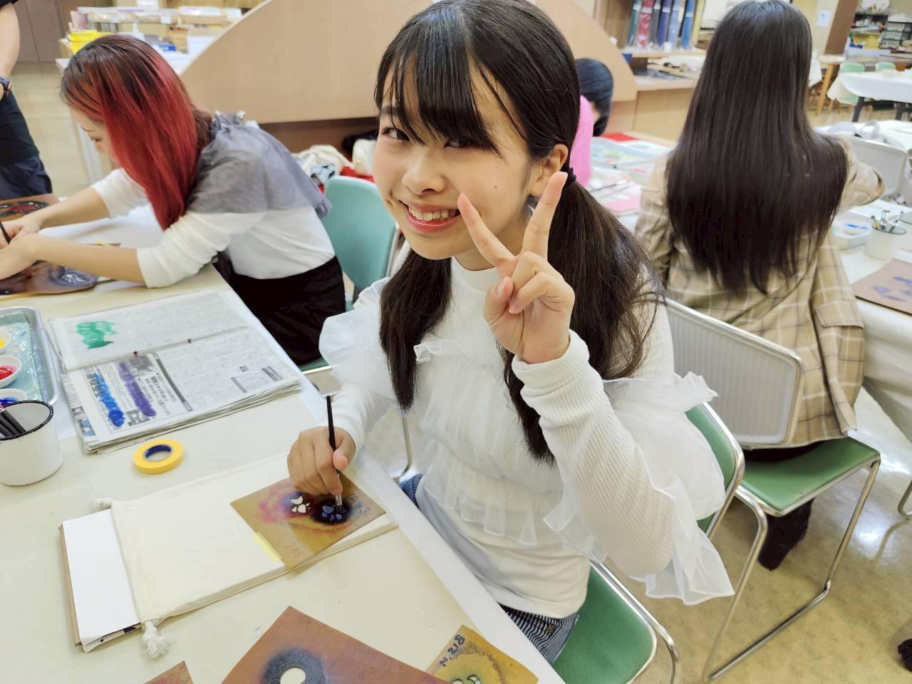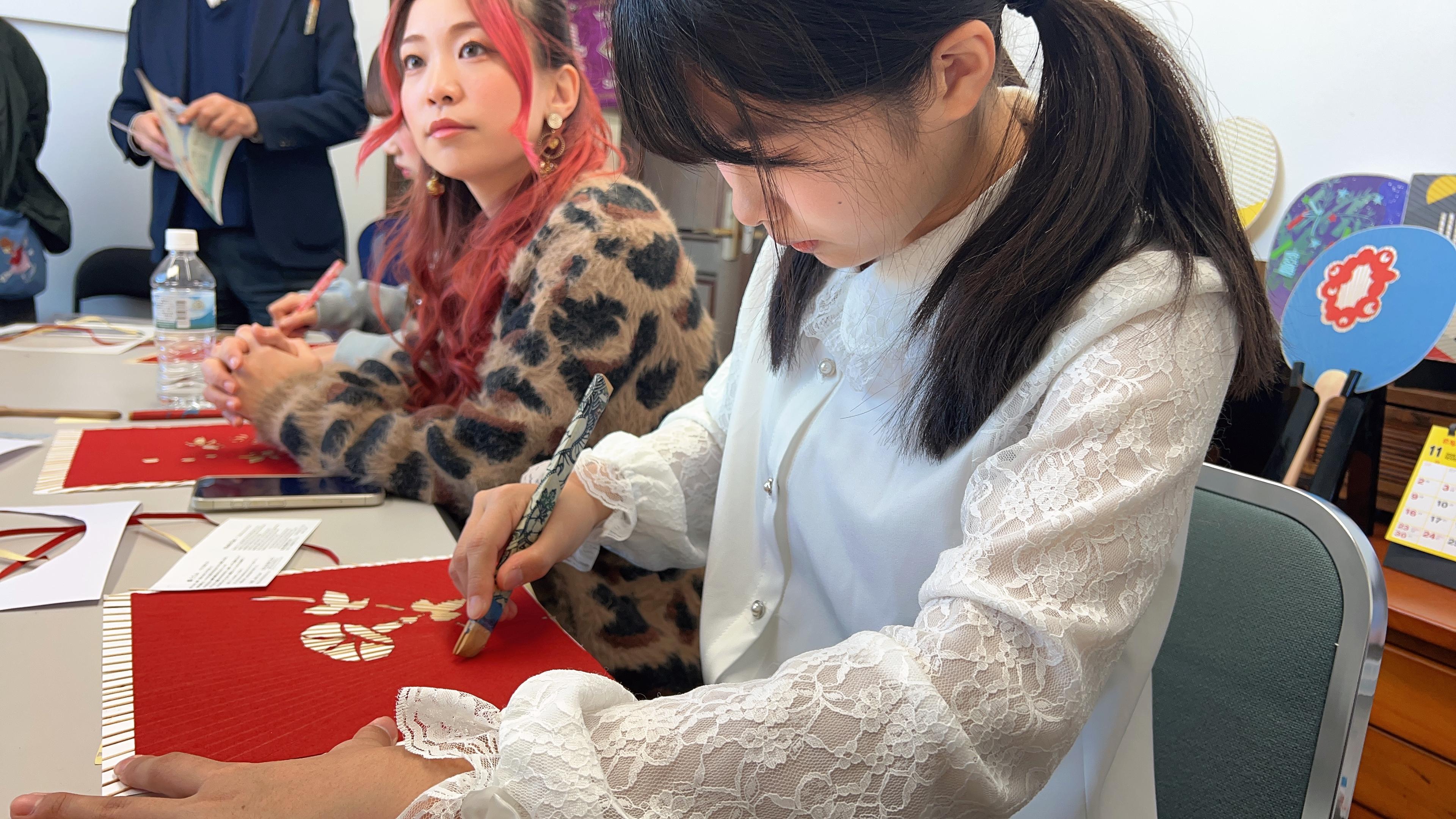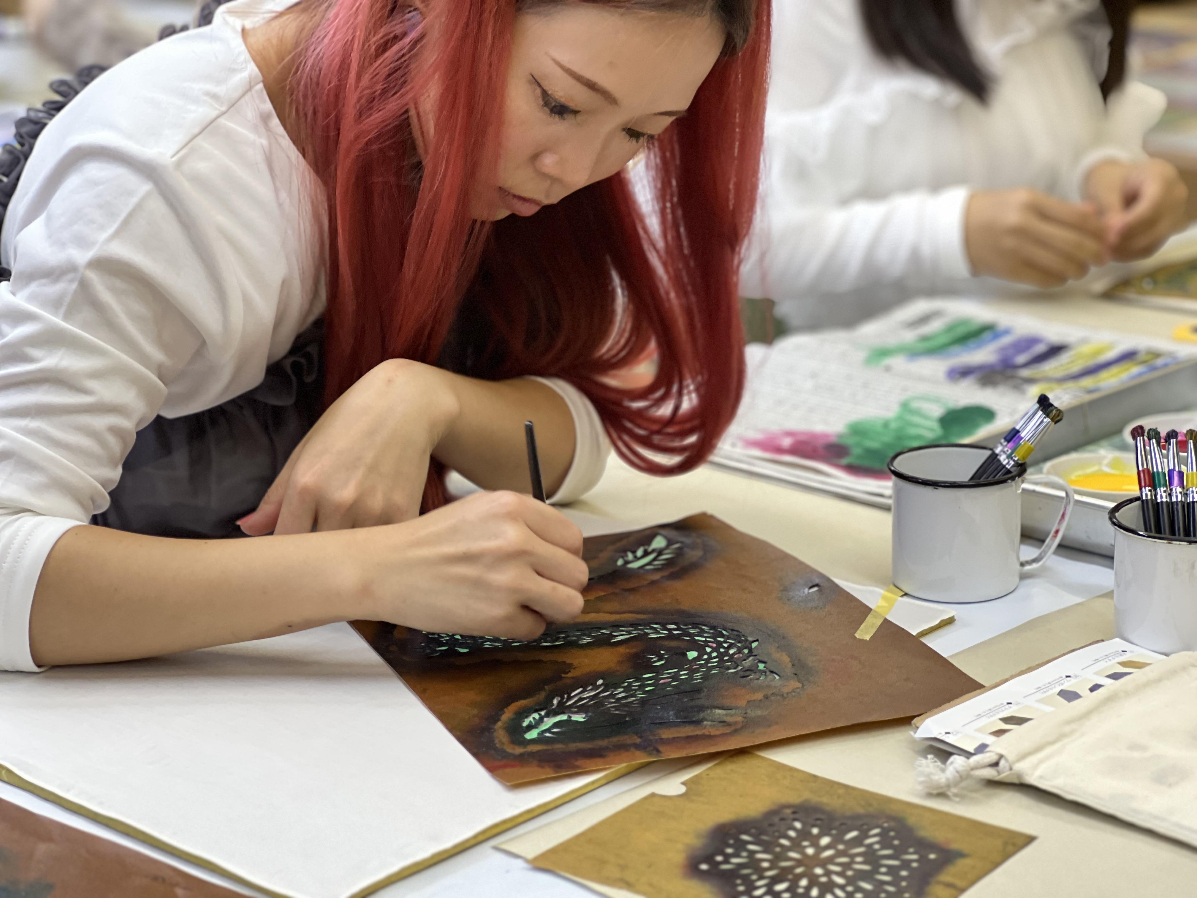 この日は愛知県の伝統的工芸品「名古屋黒紋付染」のマーブリング染め体験と、東京の伝統的工芸品「江戸切子」を体験しました。