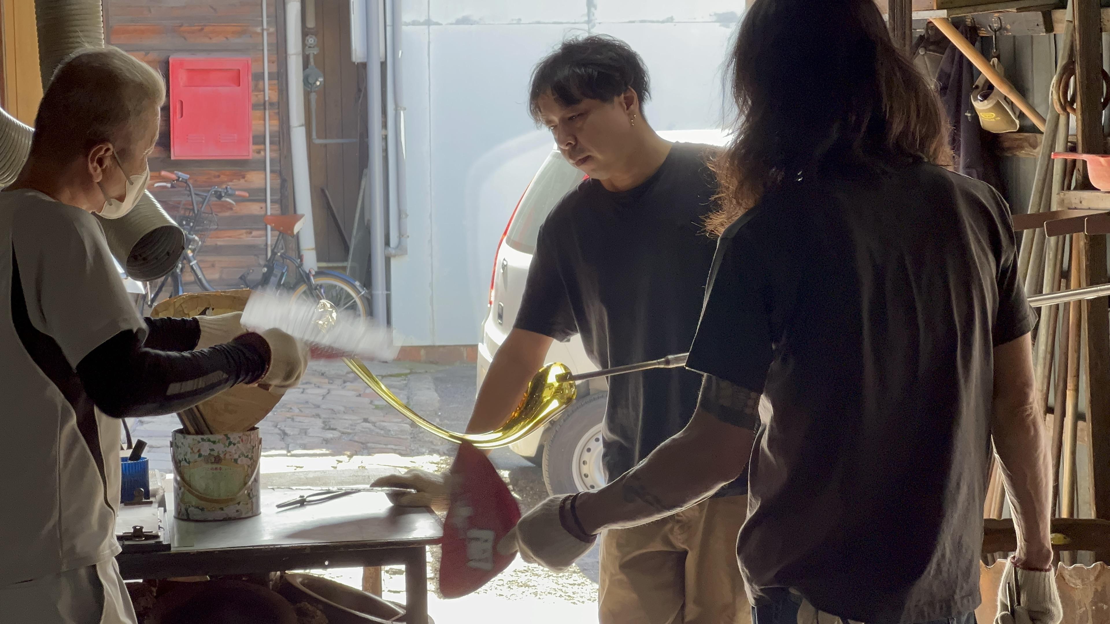 炉にとかされたガラスを水あめのように伸ばしていく作業はとても楽しそうに見えて、相当危険が伴う作業の為、職人の皆さん本当に真剣な目で作業されておりました。