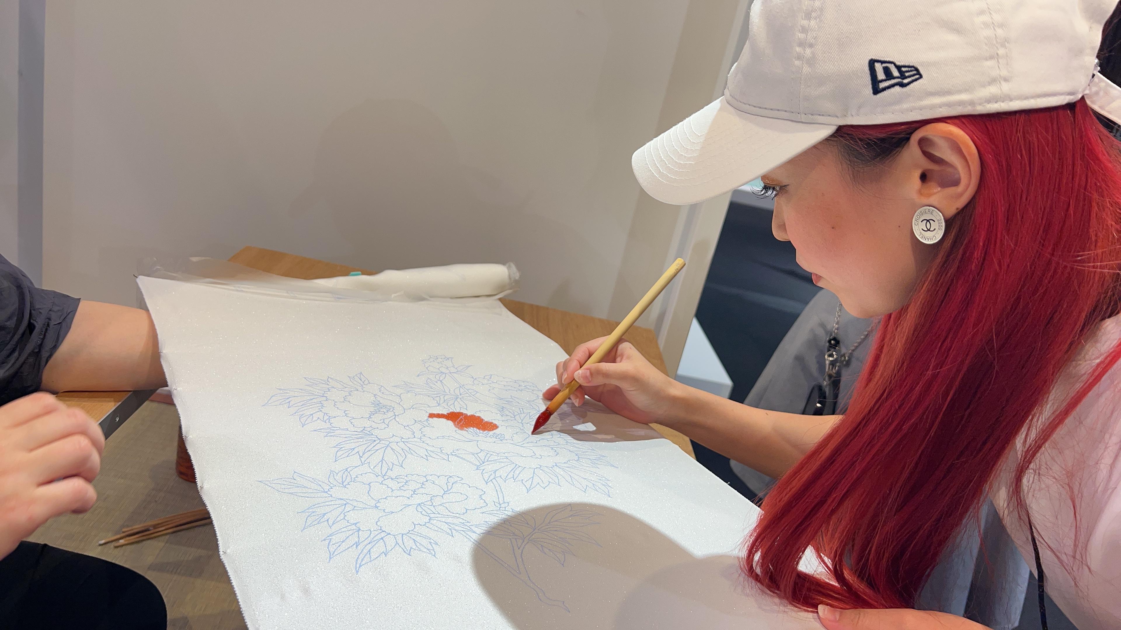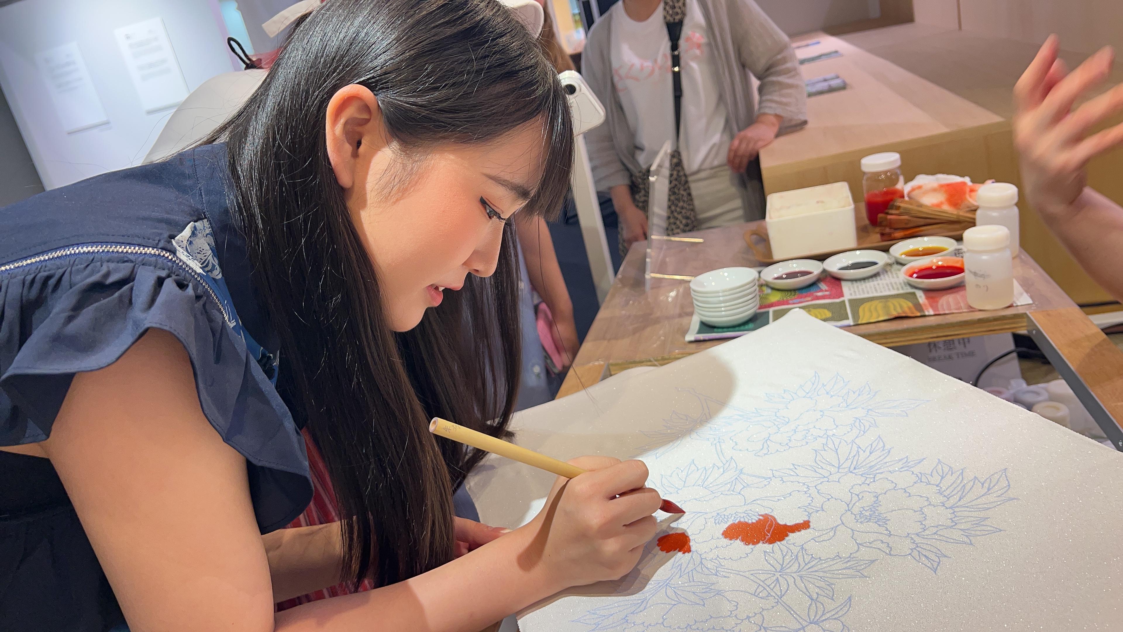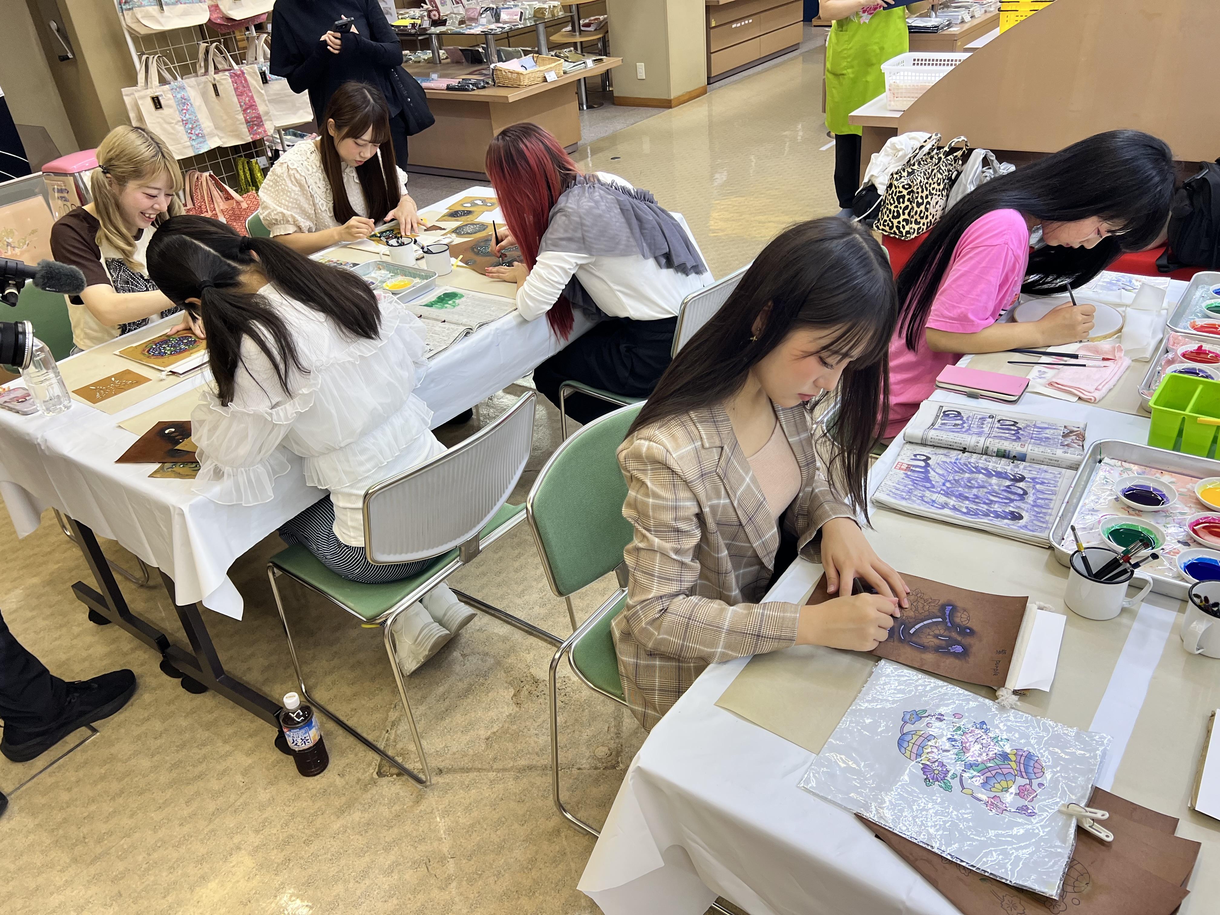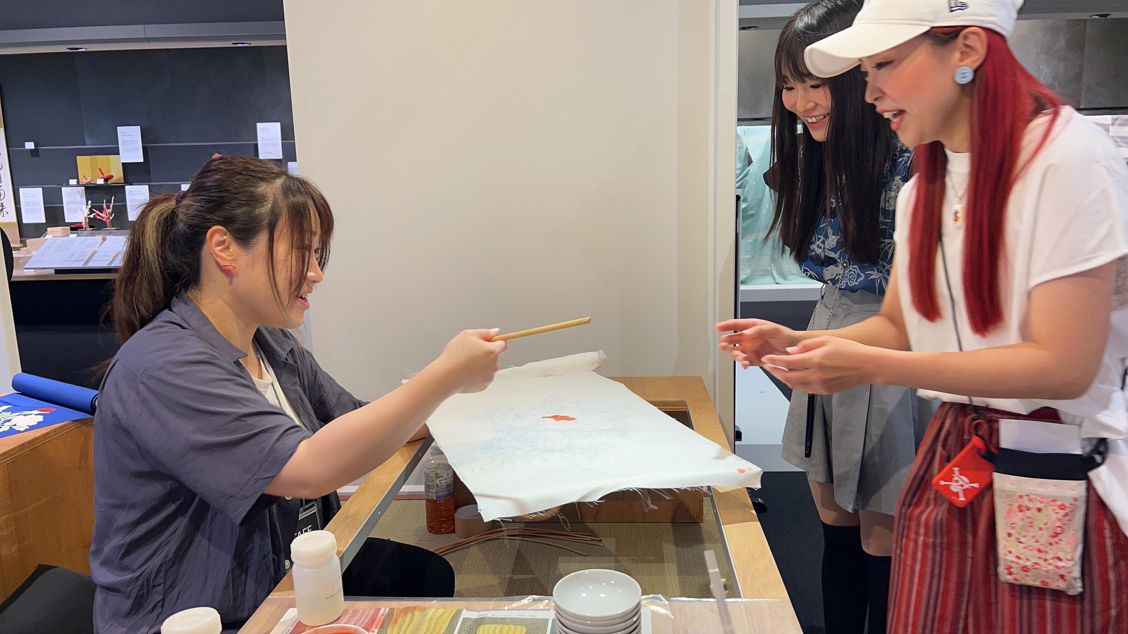 定期的に施設内で職人さんの実演が行われているとのことでしたが、今回は京友禅 の実演をされており、興味津々でのぞき込むメンバーに「やってみますか?」と。